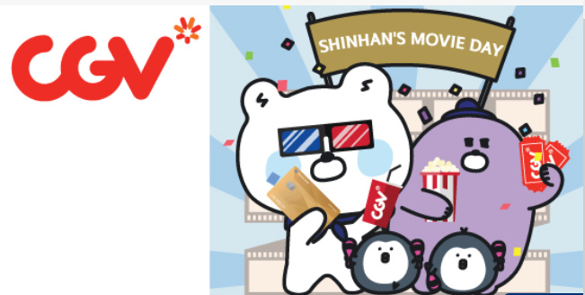 - Chương trình áp dụng tại các cụm rạp CGV có chi nhánh của Ngân hàng Shinhan (Hà Nội, Thành phố Hồ Chí Minh, Hà Nam, Đà Nẵng, Vĩnh Phúc, Thái Nguyên, Hải Phòng, Đồng Nai, Bình Dương và Bắc Ninh)